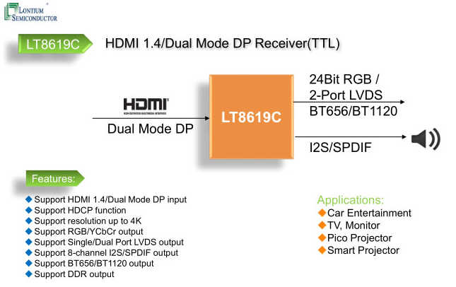 The Lontium’s LT8619C is a high performance HDMI/Dual-mode DP receiver chip based on ClearEdge? Technology, compliant with the HDMI 1.4 specification. The TTL output can support RGB, BT656, BT1120 and the output resolution can support up to 4Kx2K@30Hz resolution.
