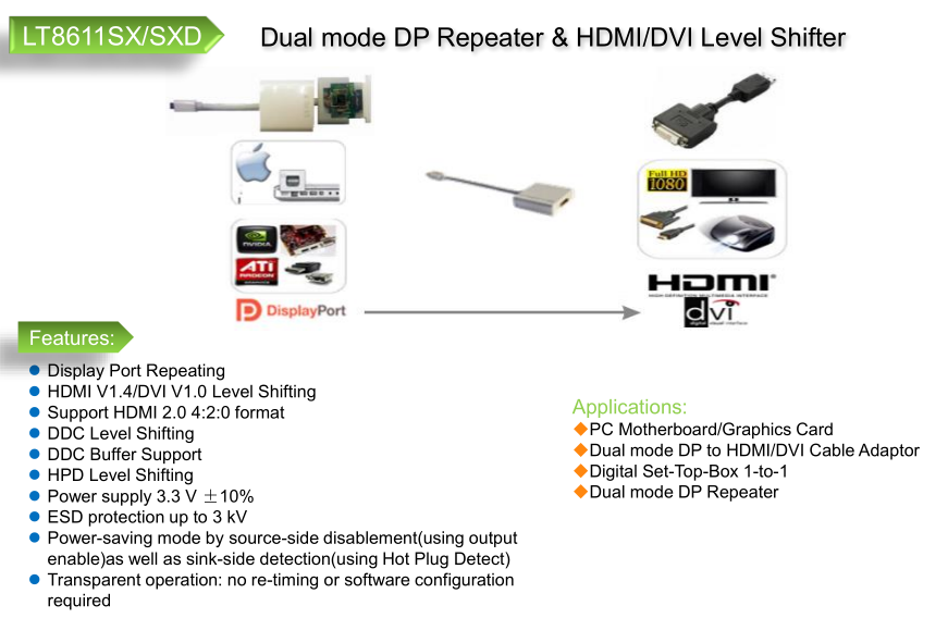 LT8611SX integrates 1-to-1 DP Repeater & HDMI/DVI Level Shifter to simplify system level design and reduce system level cost for applications requiring single DP or HDMI/DVI input and single output device in personal computing system and other emerging digital appliances.