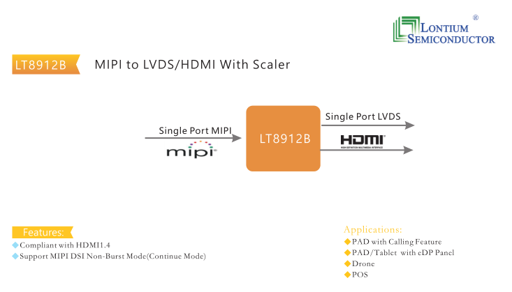The LontiumLT8912 MIPI?DSI to LVDS and HDMI bridge features a single-channel MIPI?D-PHY receiver front-endconfiguration with 4 data lanes per channel operating at 1.5Gbps per data lane and a maximum input bandwidth of 6Gbps.