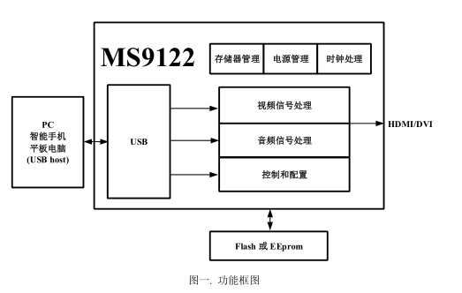 據接口和音視頻處理模塊。MS9122 可以通過 USB 接口顯示或者擴展 PC、智能手機、平板電
