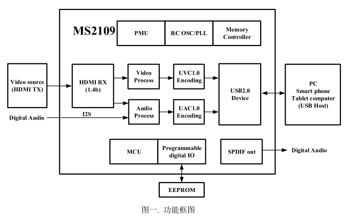 模塊,音視頻處理模塊,MS2109 可以將 HDMI 接口輸出的音視頻信號,通過 USB 接口傳送