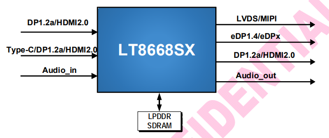 For LVDS output, LT8668SX can be configured as single-port , dual-port or four-port LVDS with 1 high- speed clock lane, and 3~5 high-speed data lanes, which can support a total bandwidth up to 24Gbps.
